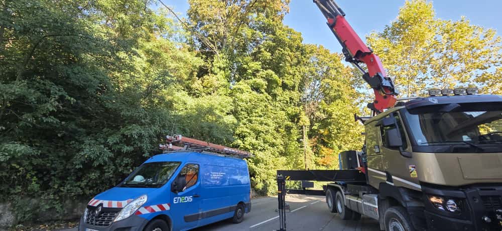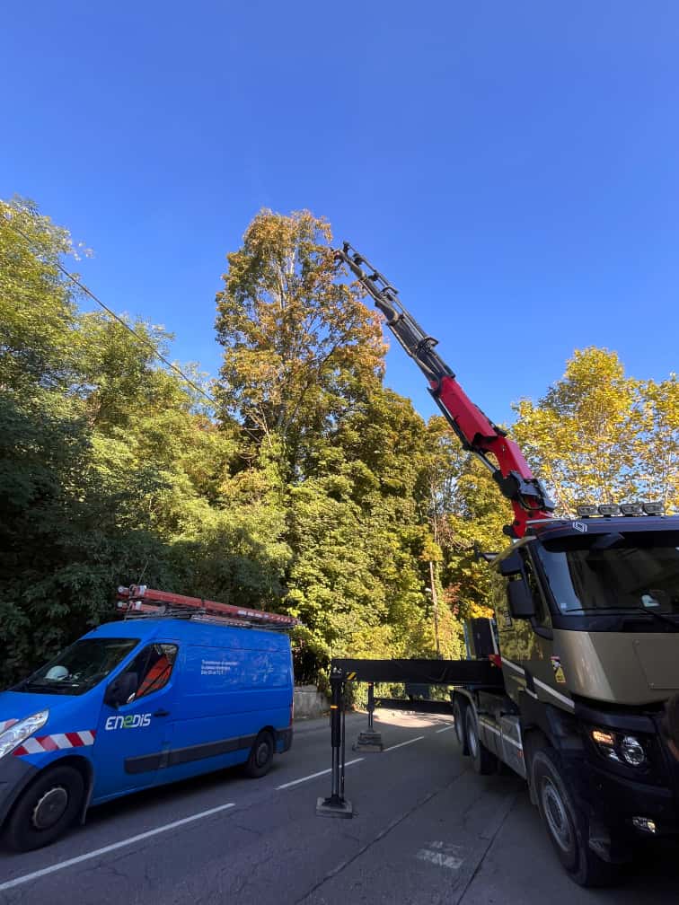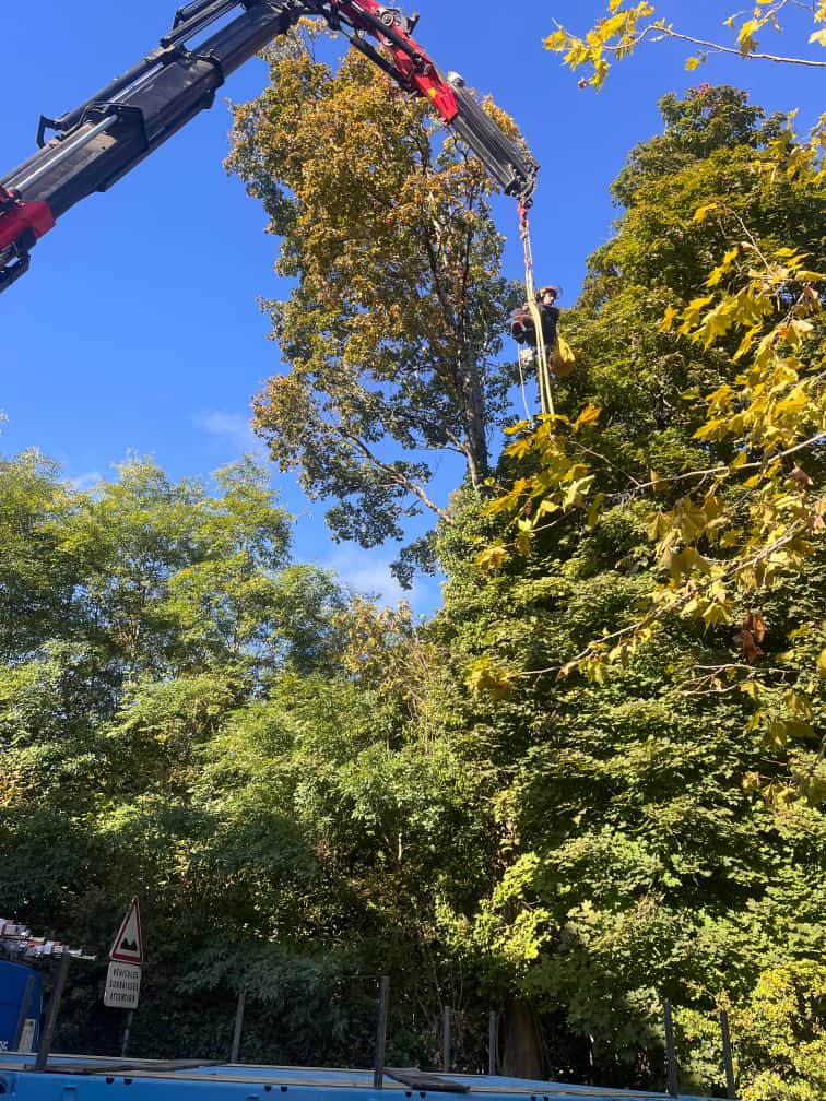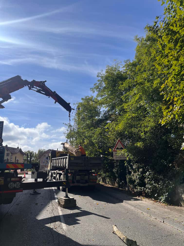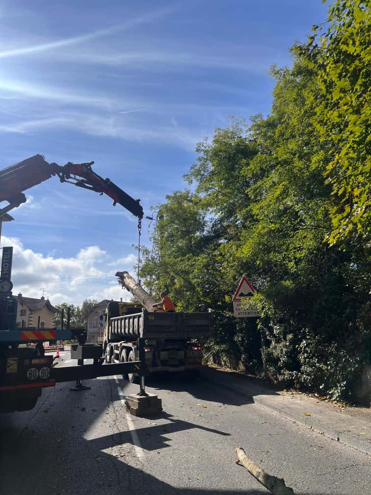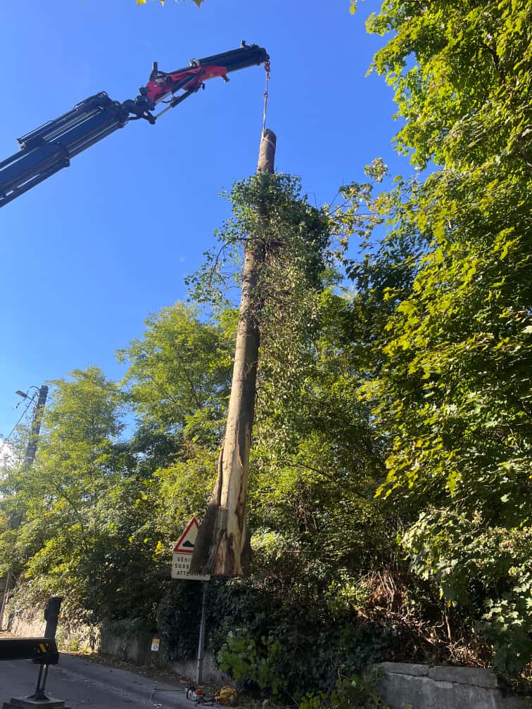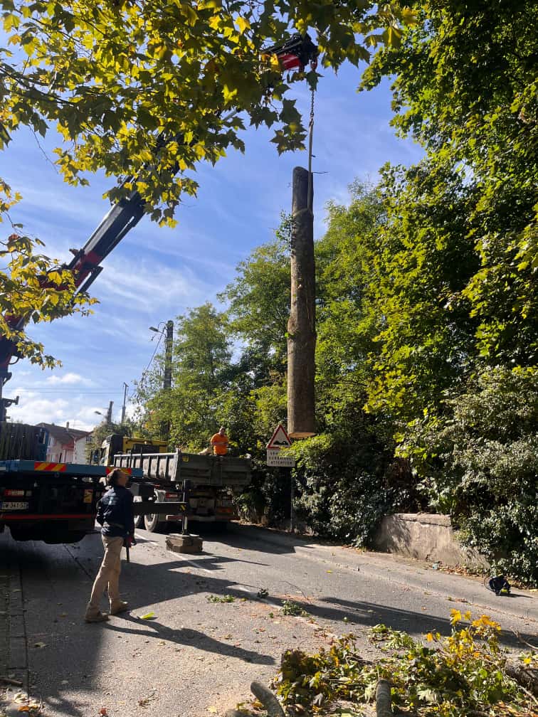 Face au danger, une opération d’abattage par démontage a été programmée. Pour garantir une intervention sûre et maîtrisée, nous avons mobilisé un camion-grue de 63 tonnes permettant la dépose progressive de l’arbre, branche par branche, dans un environnement étroit et sensible.