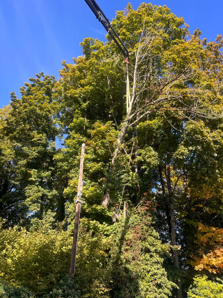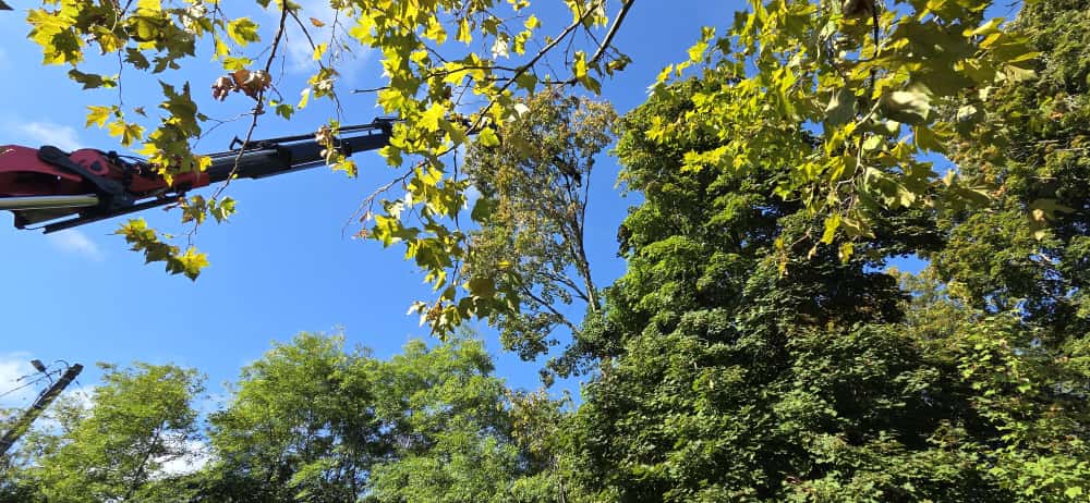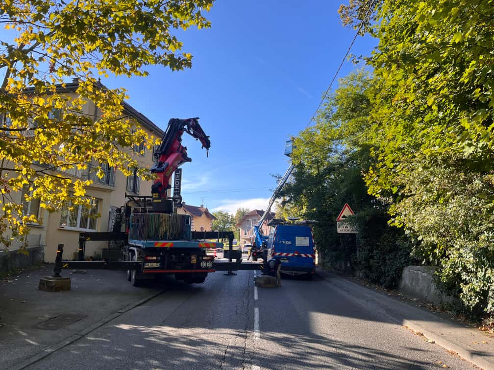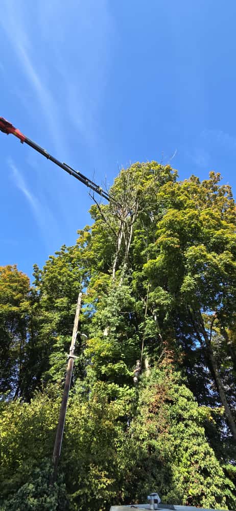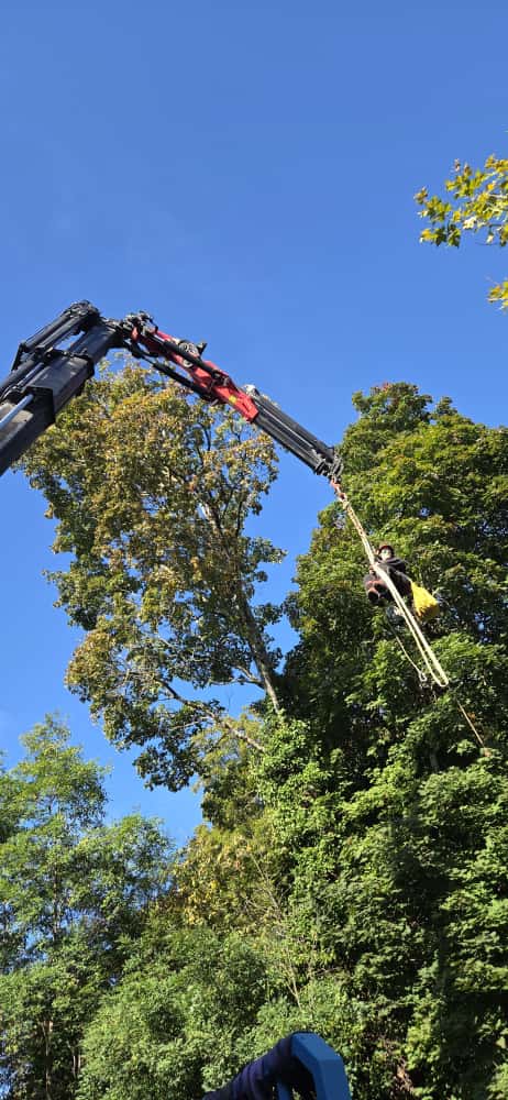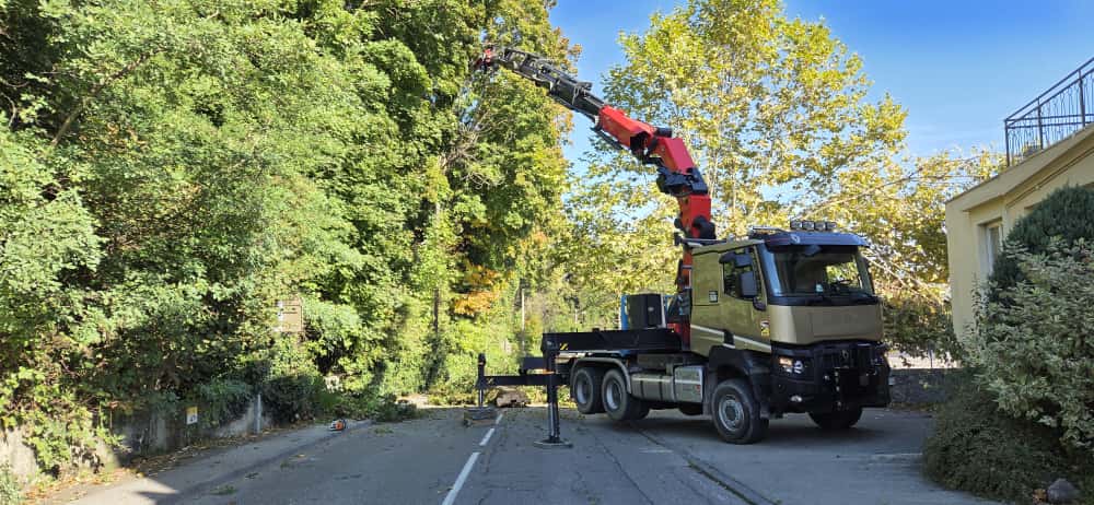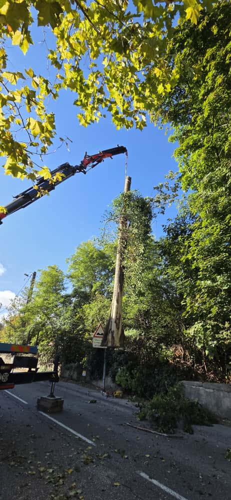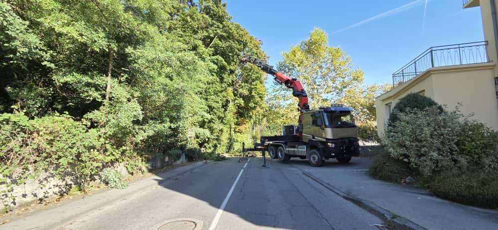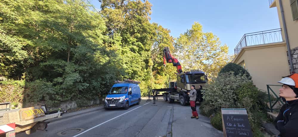 Face au danger, une opération d’abattage par démontage a été programmée. Pour garantir une intervention sûre et maîtrisée, nous avons mobilisé un camion-grue de 63 tonnes permettant la dépose progressive de l’arbre, branche par branche, dans un environnement étroit et sensible.