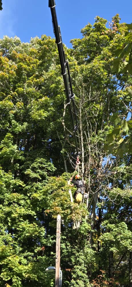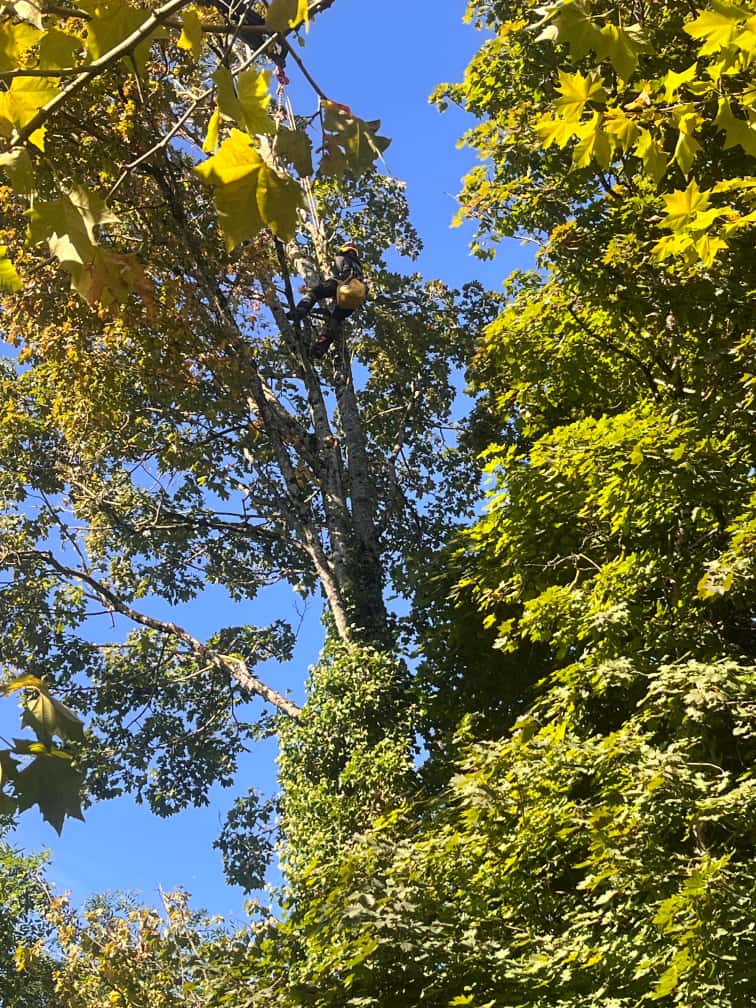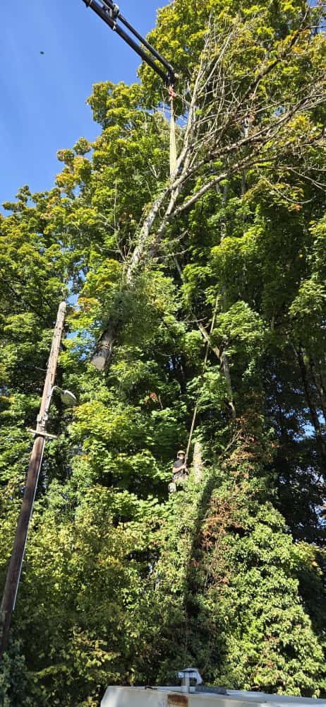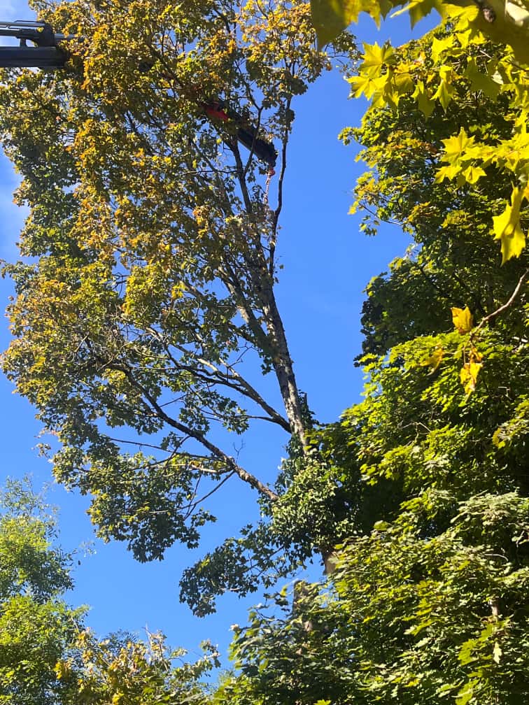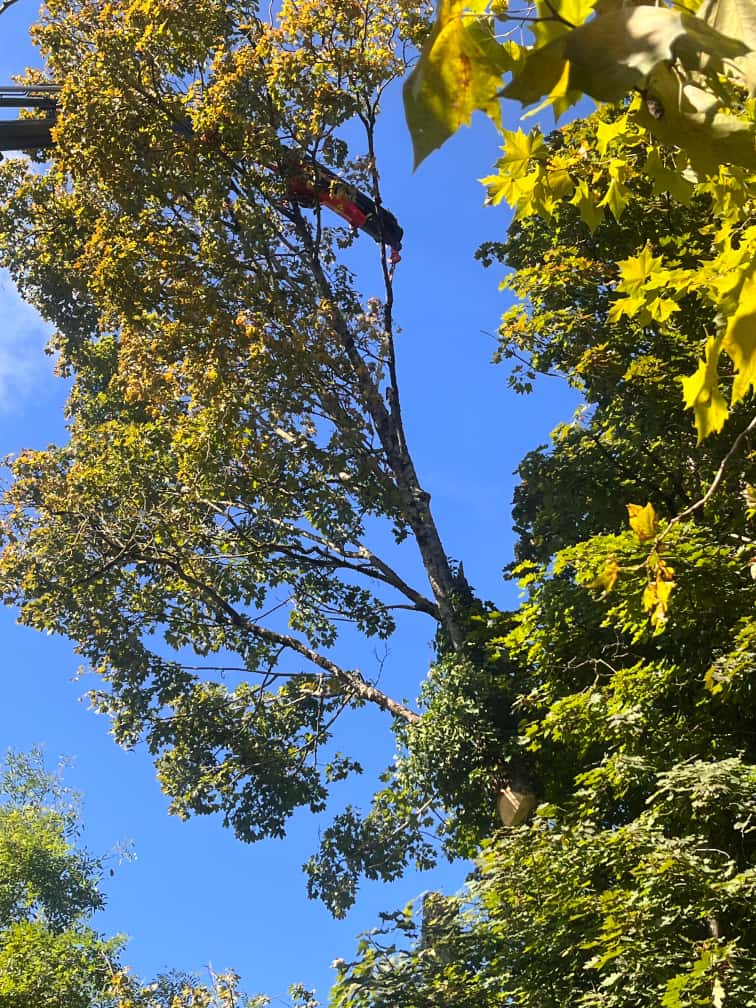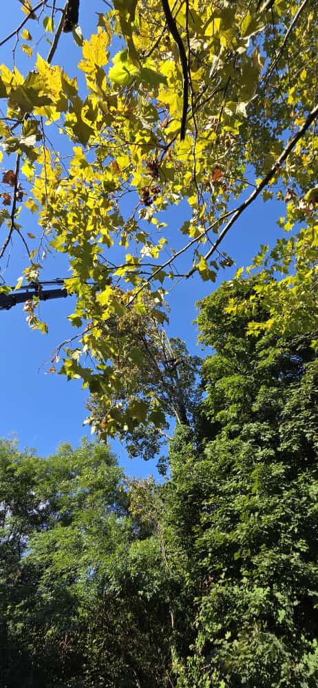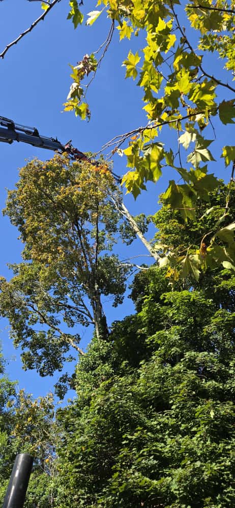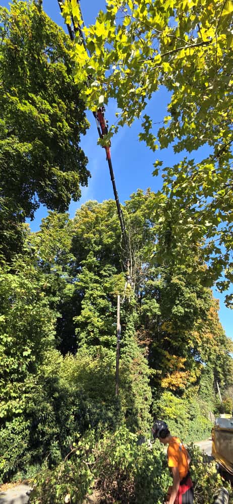 Face au danger, une opération d’abattage par démontage a été programmée. Pour garantir une intervention sûre et maîtrisée, nous avons mobilisé un camion-grue de 63 tonnes permettant la dépose progressive de l’arbre, branche par branche, dans un environnement étroit et sensible.